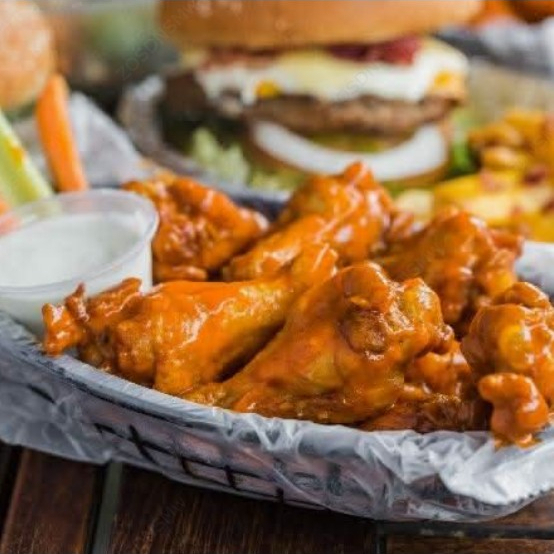 7 pzas De alas, bañadas en tu salsa a elegir y acompañadas de aderezo, apio y zanahorias.