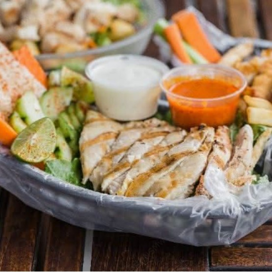 Pechuga de pollo asada a la parrilla cortada en tiras sobre lechugas y acompañada de jícama, zanahoria, aderezos y salsa.