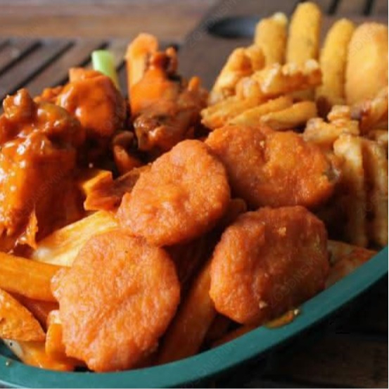 2 Chil-osos, 3 garritas, papas crisscut, 4 nuggets, 4 alitas y paposas bañadas en salsa de tu elección, aderezo blue cheese y baritas de apio y zanahoria.