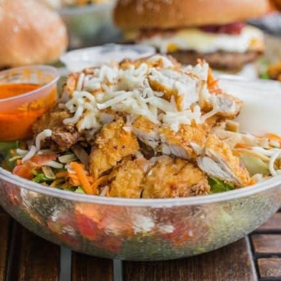 Pechuga de pollo con empanizado crujiente y picosito sobre cama de papas fritas con apio, zanahoria, aderezo y salsa.