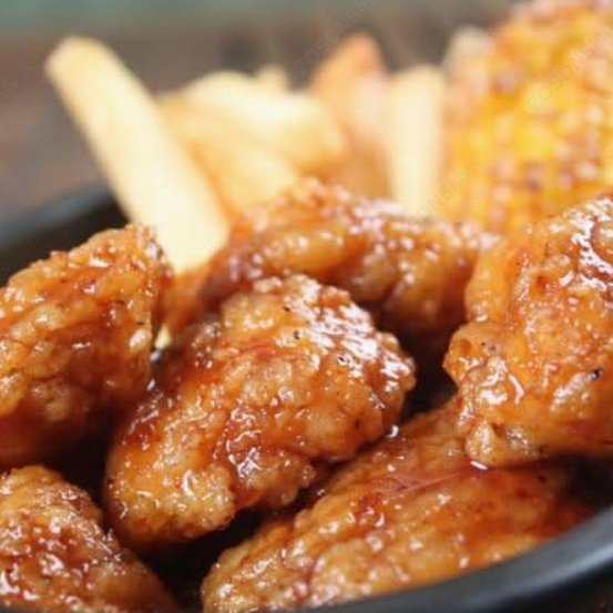 Trocitos de pechuga empanizados bañados con salsa especial hotney-chipotle, acompañados con elotito toreado y papas fritas.