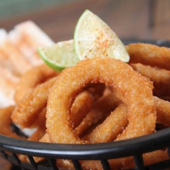 Aros de cebolla capeados con baritas de jícama con chilito.