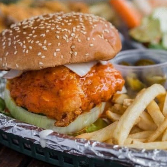 Pechuga de pollo con empanizado crujiente y picosito bañada en salsa a tu elección en pan de hamburguesa con aderezo blue cheese.
