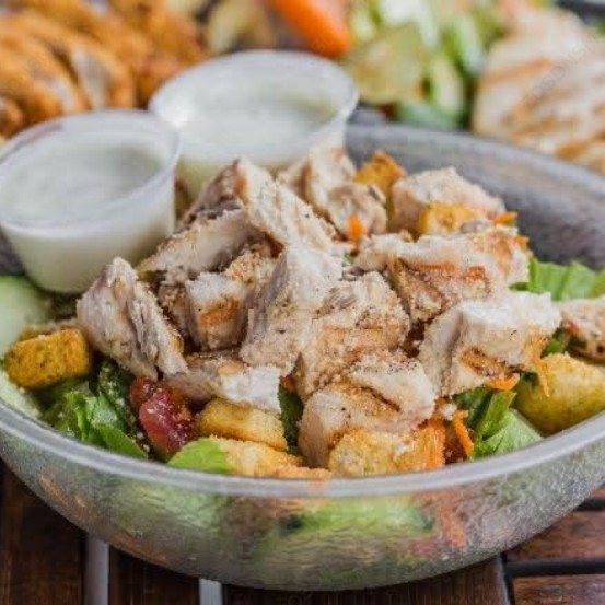 Combinación de lechuga orejona, zanahoria, pepino, tomate, queso parmesano, semillas de girasol y crotones con pechuga al gusto.
