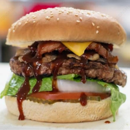 Tiras de tocino, champiñones salteados y salsa BBQ, se complementan a la tradicional del oso con 150 g de carne de arrachera, con aderezo especial, pepinillos, tomate, cebolla, lechuga, queso amarillo, acompañada de papas fritas.