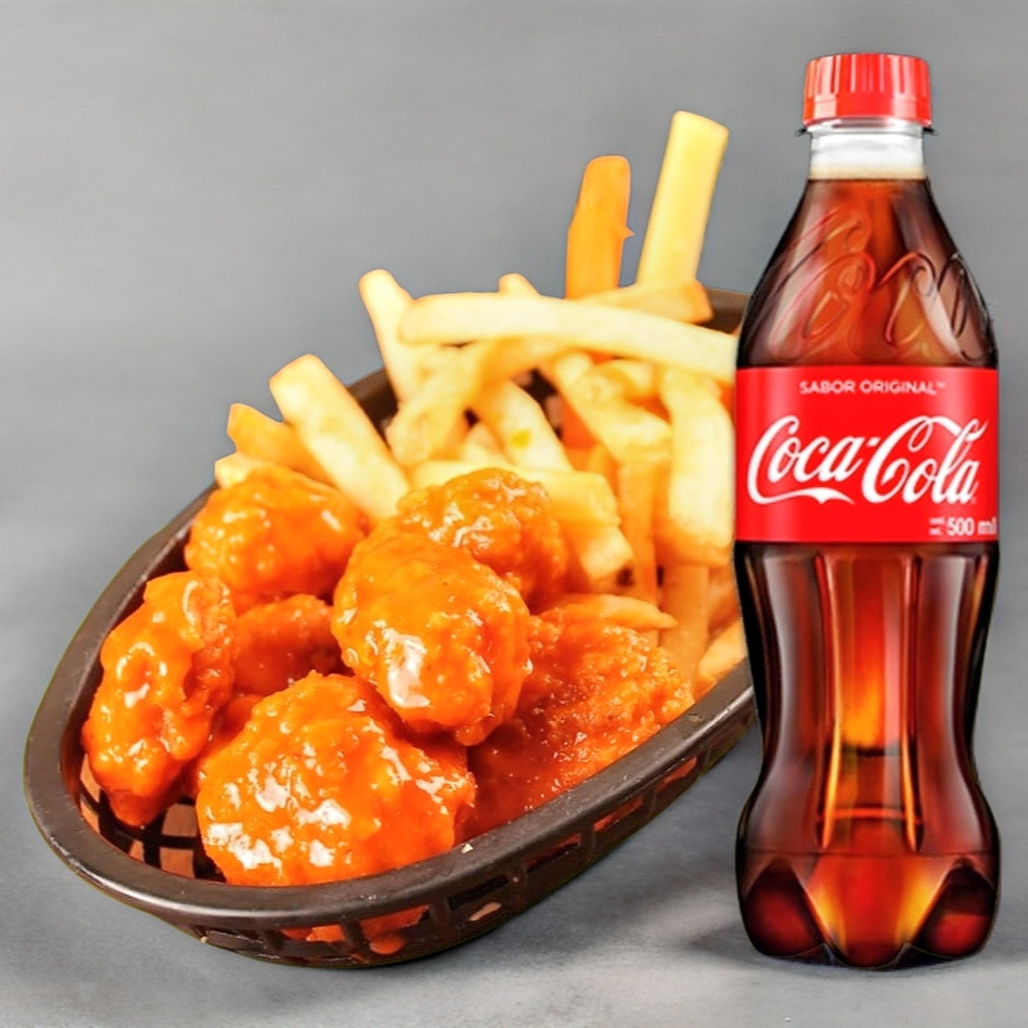 Trocitos de pechuga cubiertos de nuestra receta crujiente y bañados en salsa de alitas, acompañados de papas fritas, aderezo, varitas de apio y zanahoria más refresco Coca Cola 355 ml.