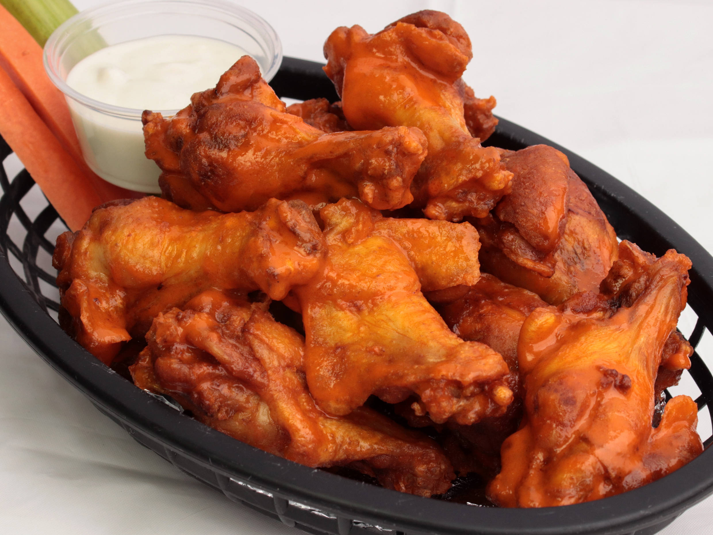 20 Alitas bañadas en salsa, acompañadas de aderezo y varitas de apio con zanahoria.