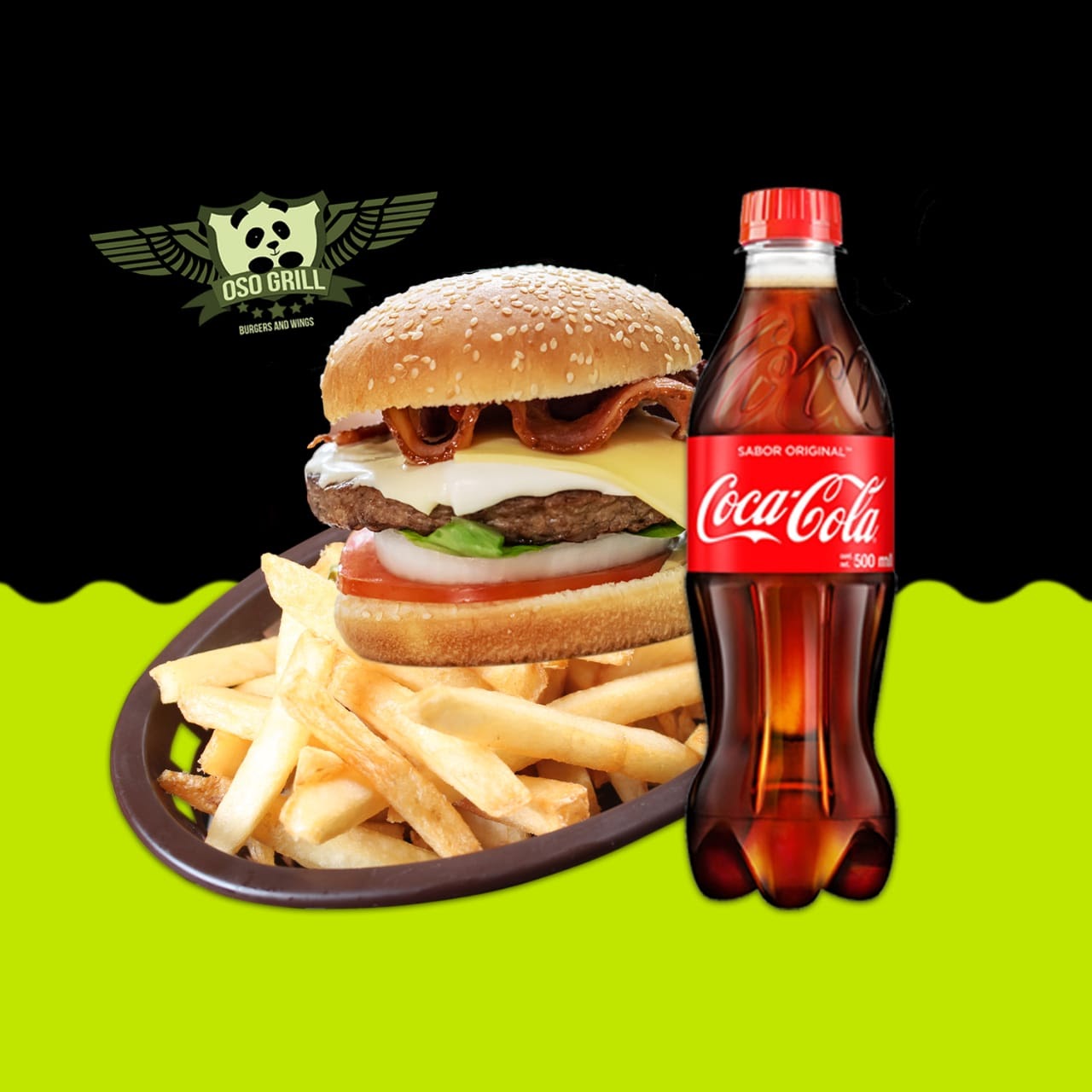 150 g De carne de arrachera para hamburguesa, fusionada con una combinación especial de 4 quesos y crujientes tiras de tocino sobre una base de pan con aderezo especial, pepinillos, tomate, cebolla y lechuga fresca, todo acompañado de papas a la francesa más refresco Coca Cola 355 ml.