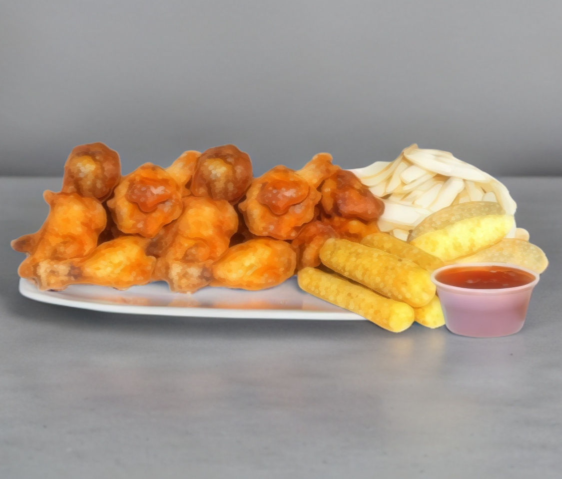2 Chil-osos, 3 garritas, papas criss cut, 4 nuggets, 4 alitas y paposas bañadas en salsa de tu elección, aderezo ranch, varitas de apio y zanahoria.