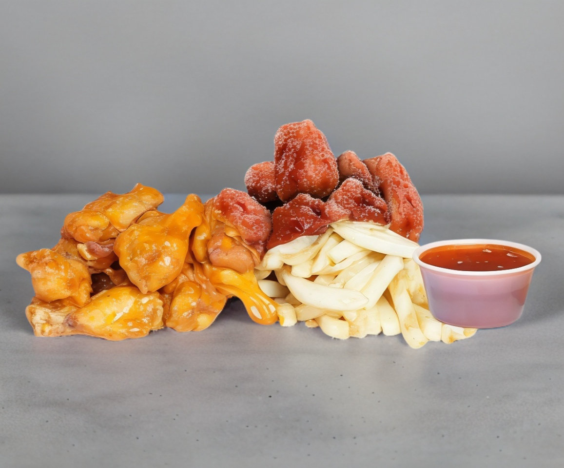 Combo de 5 alitas y 5 boneless bañados en salsa a elección acompañados de papas fritas.