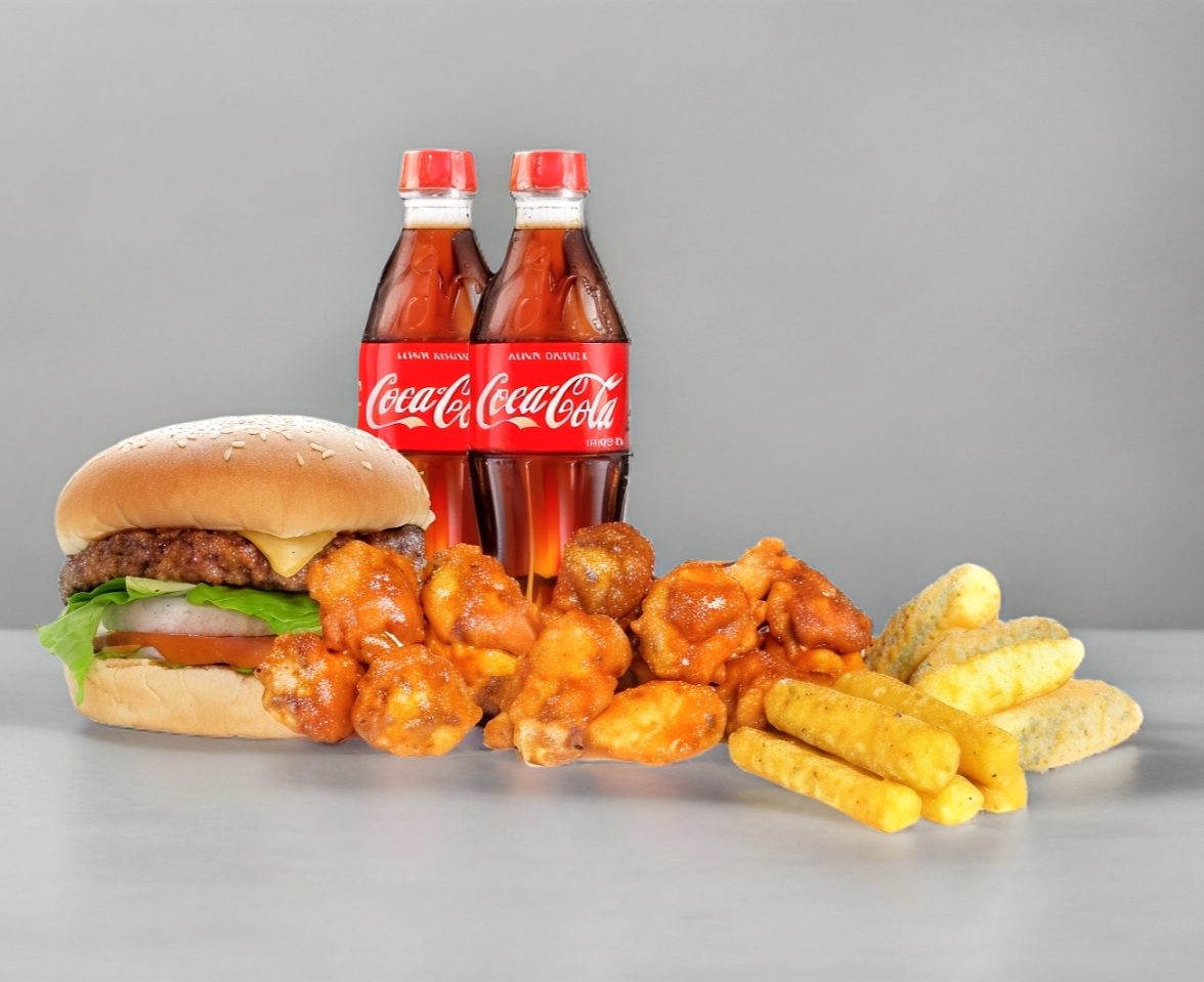 1 Hamburguesa koala con papas, 10 alitas, 2 refrescos, chilosos (4 pzas) ó garritas (5 pzas).