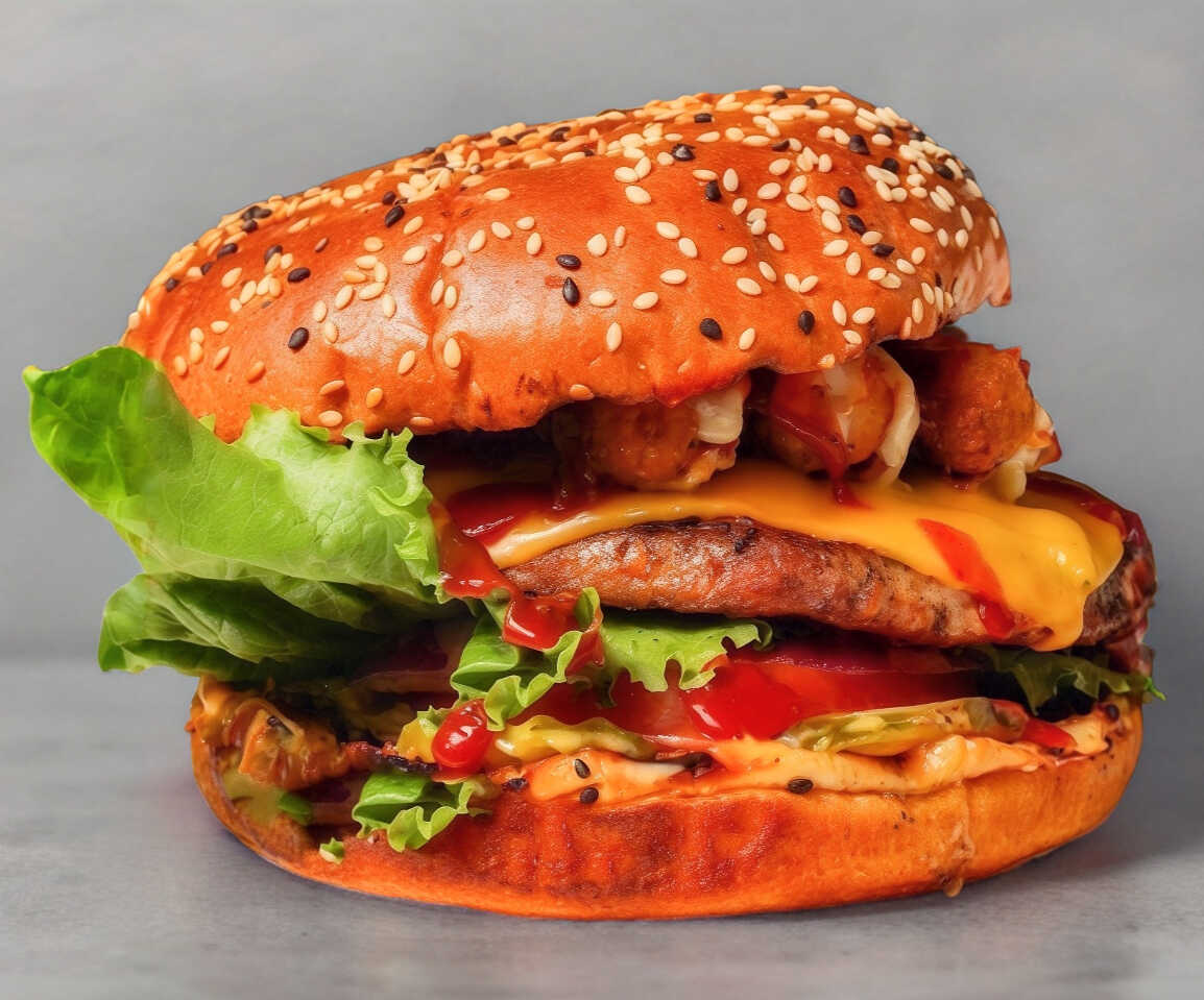 Hamburguesa acompañada de lechuga, tomate, cebolla y pepinillos, queso americano, 3 garrita de oso bañadas con nuestra original salsa marinara y acompañada de papas fritas.