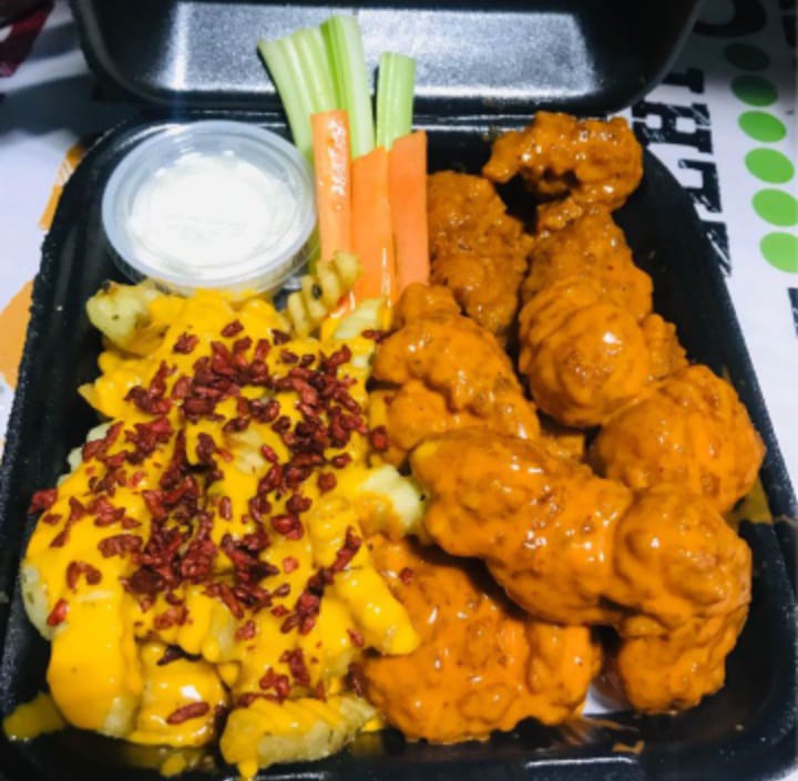 400 gramos de Boneless, acompañados de papás a la francesa 150 gramos , bañados en tu Salsa favorita ,aderezo ranch, palitos de apio y zanahorias