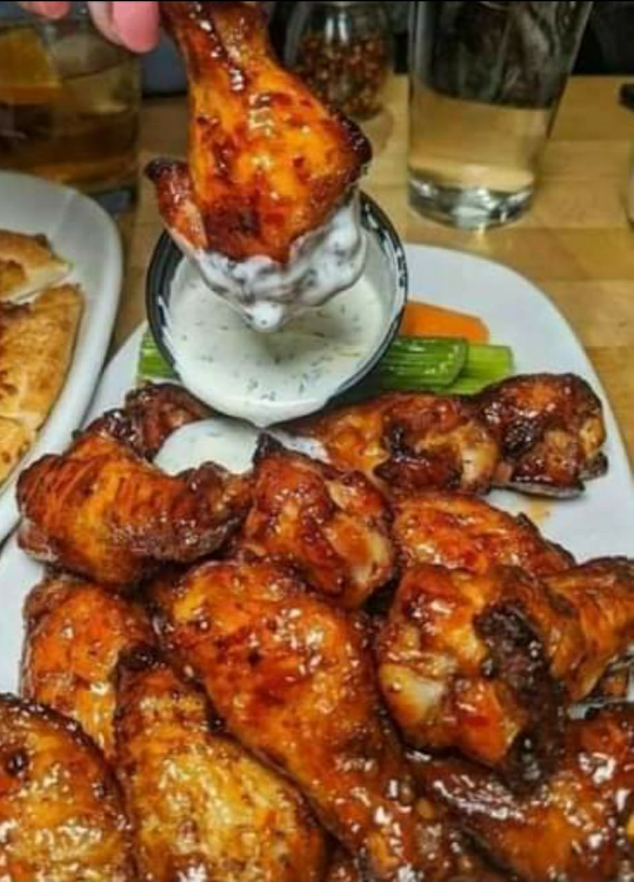 4 alitas deliciosas 😋🐣bañadas con ranch, acompañado con papas a la francesa.