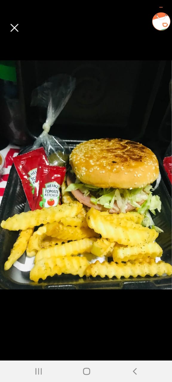 Hamburguesa sencilla de 100 gramos acompañada de vegetales, queso y papas a la francesa de 120 gramos y refresco pepsi de 400 ml.