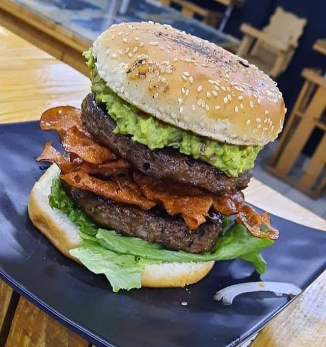 Hamburguesa de 100 gramos doble carne con doble queso americano, doble Jamón de pavo y vegetales, acompañado con papas a la francesa.