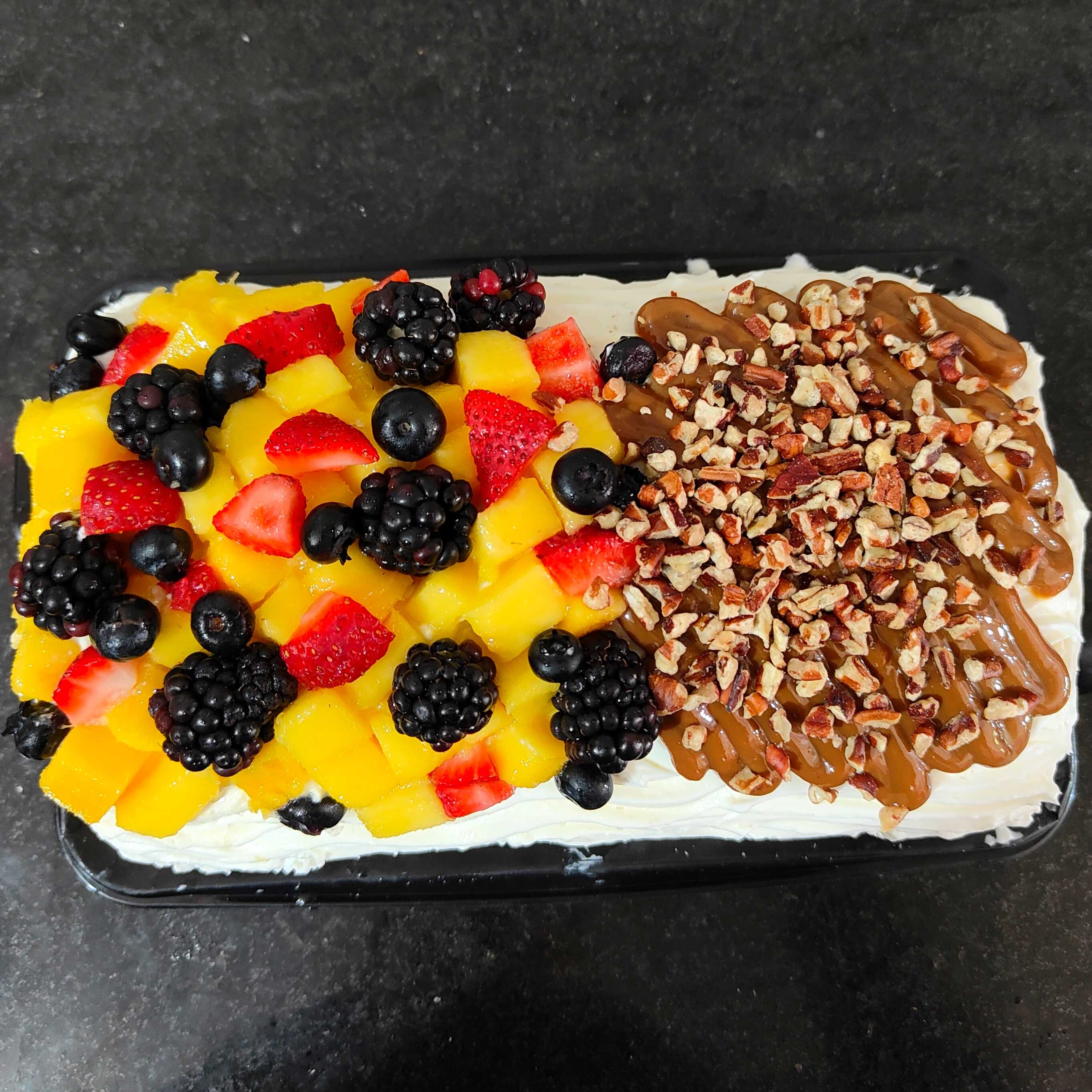 pastel relleno de mango decorado con betun de queso crema y dulce de leche con nuez