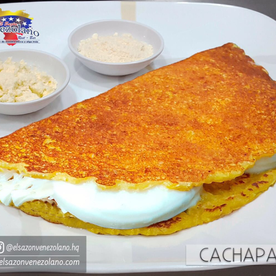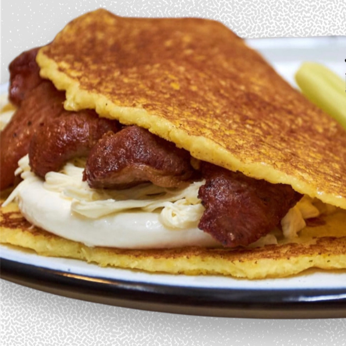 Cachapa con queso y una especialidad: Carne Mechada, Pernil, Pollo o Chicharron