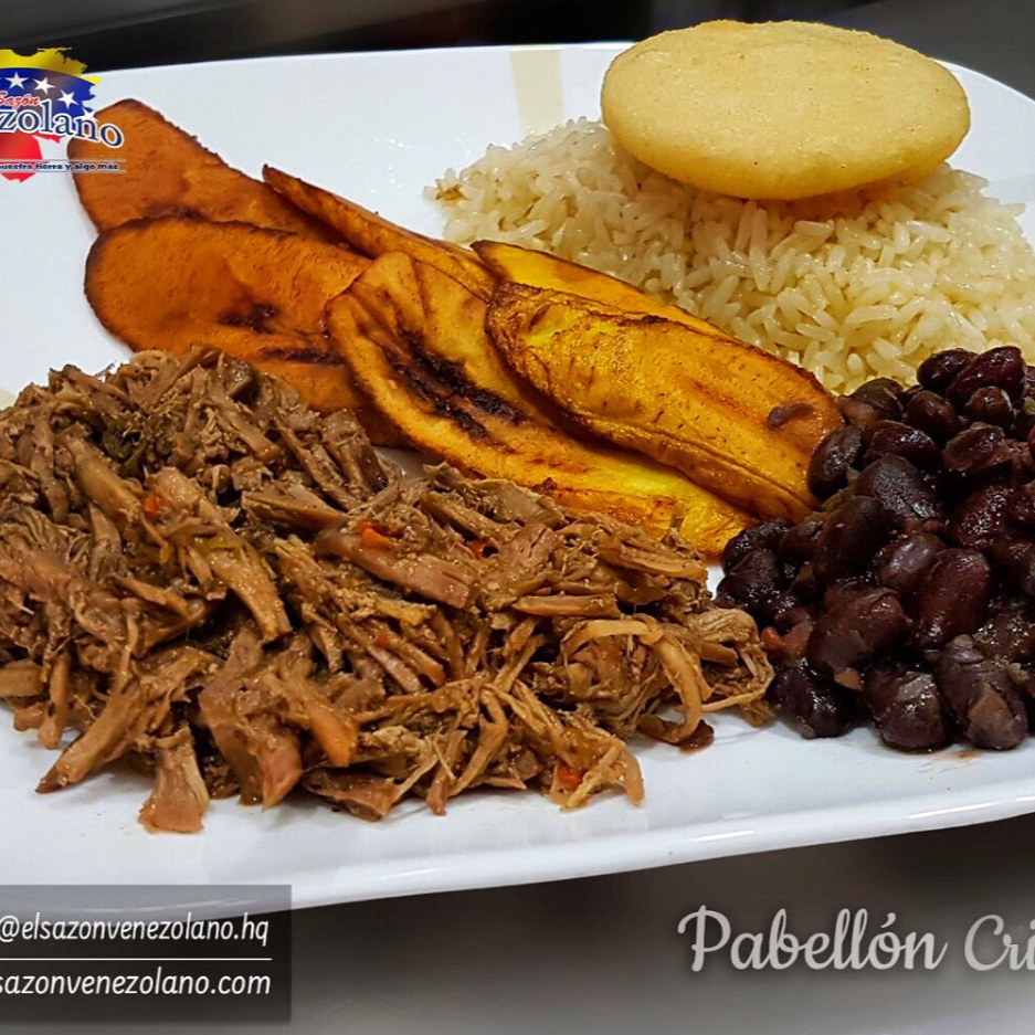 Arroz, carne mechada, platano macho frito, frijoles y arepa