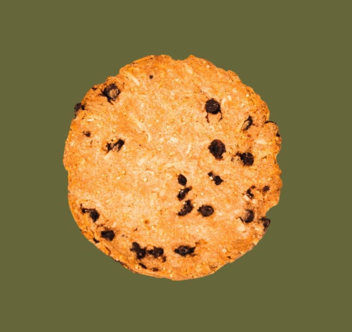 Gluten Free con harina deshidratada de papa orgánica, trozos de nuez y chispas de cacao.