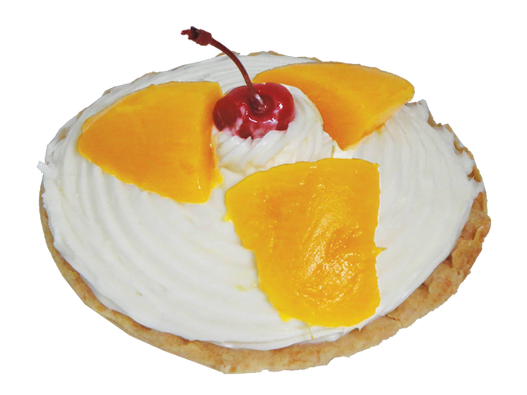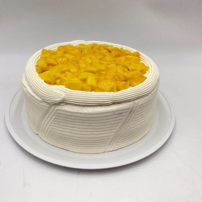 Pastel individual con pan de vainilla en 3leches, cobertura betun de queso y decorado con trozos de mango