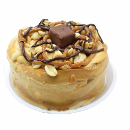Pastel individual en pan de chocolate con cobertura de queso con cajeta y decorado con cacahuate, chocolatey cajeta