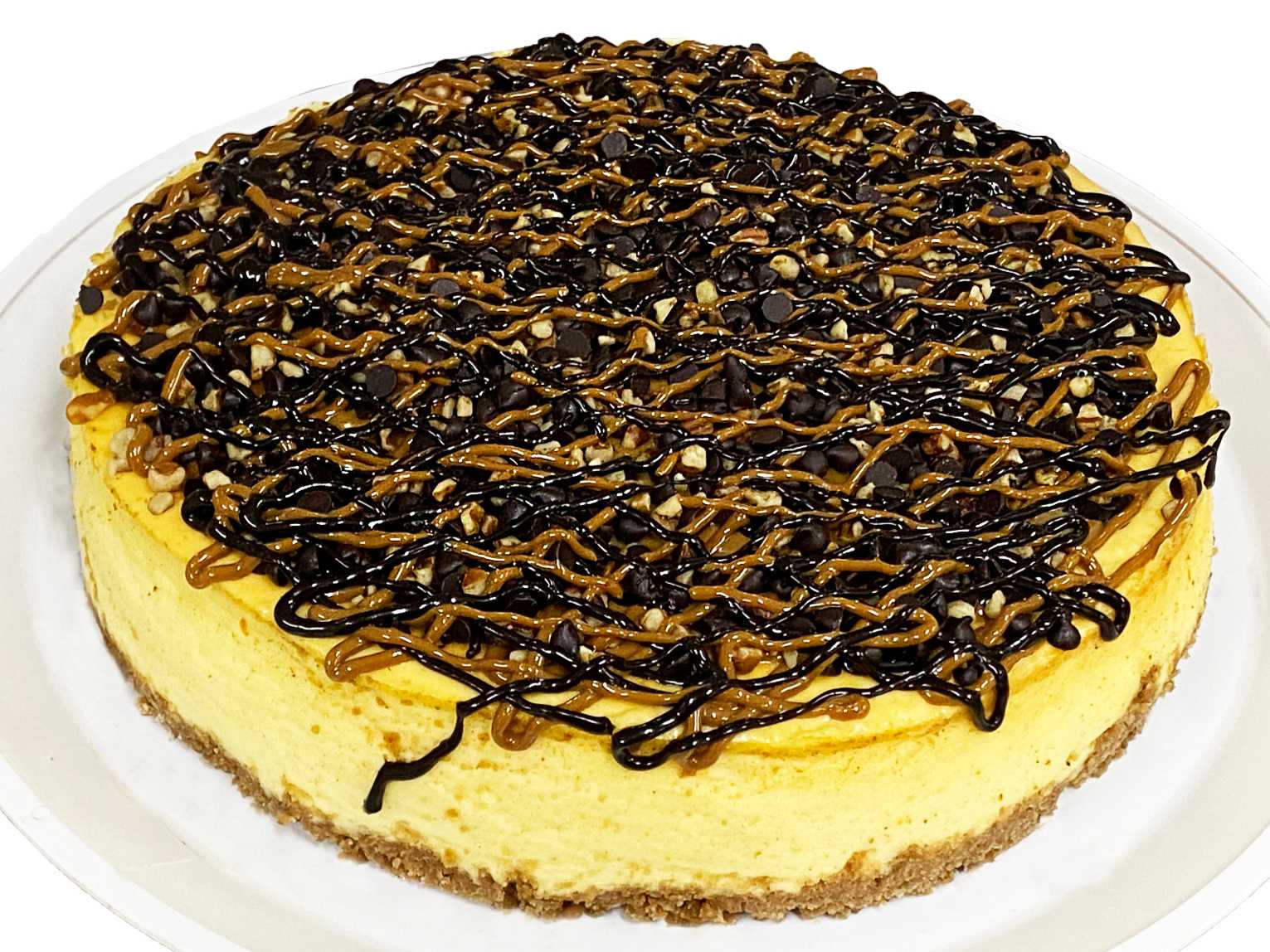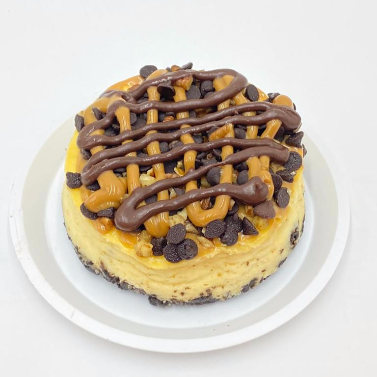 Pastel individual de queso, decordo con chispas de chocolate, nuez y cajeta