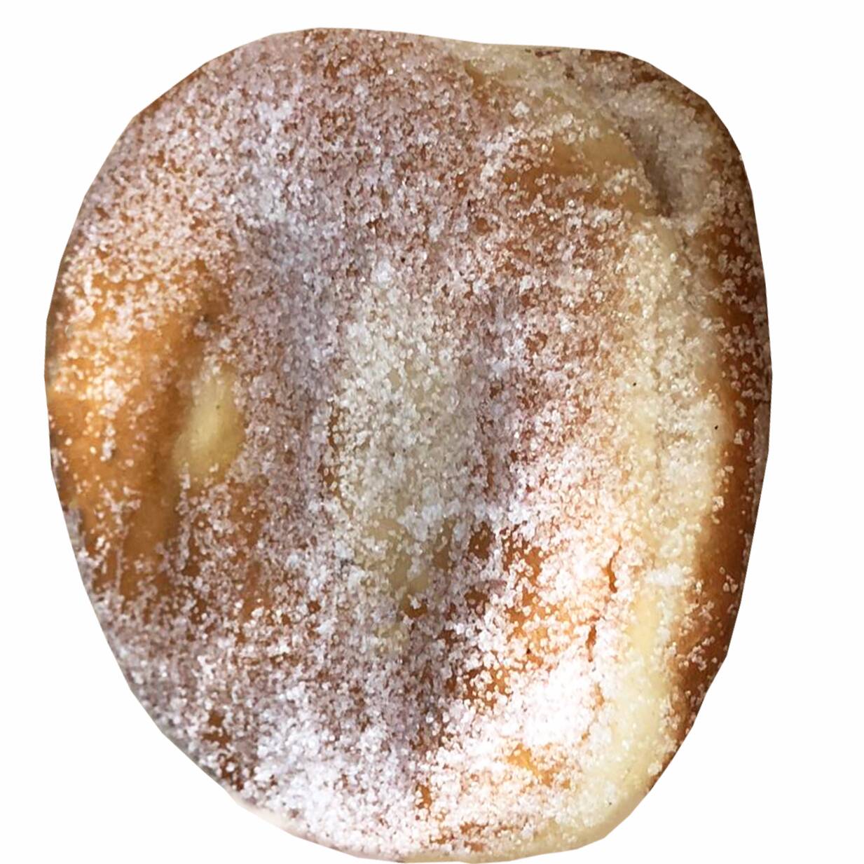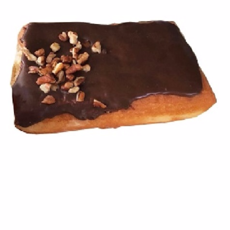Masa dona rellena de crema pastelera decorada con chocolate.