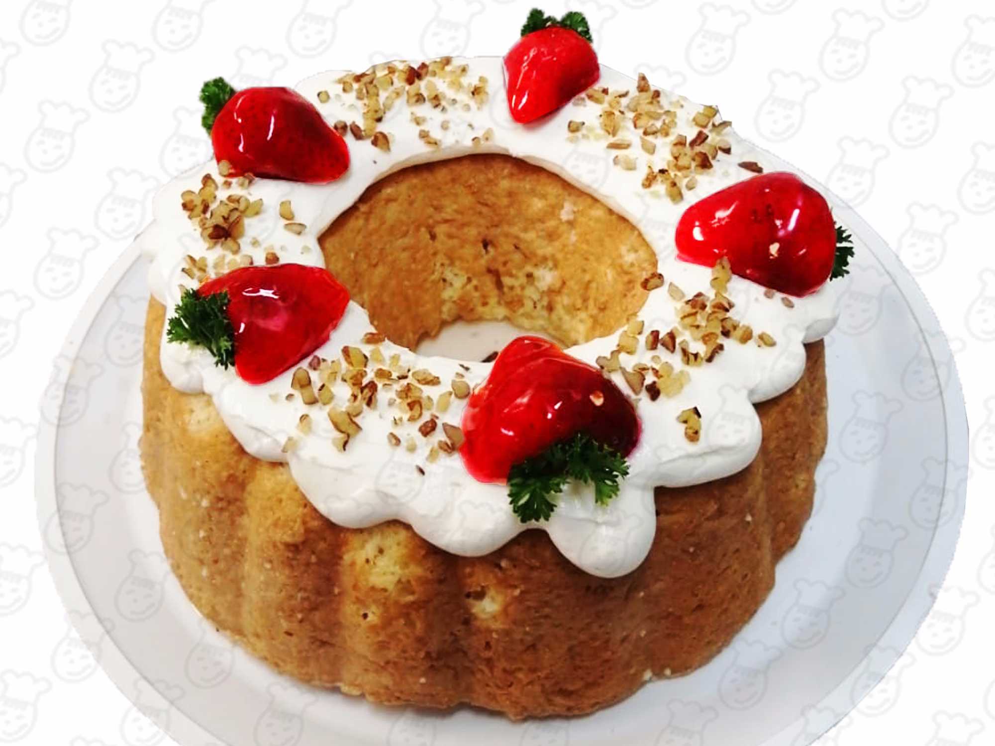 Rosca de vainilla 3 Leches con Betun de queso, decorado con Fresa y nuez