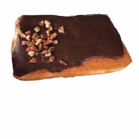 Masa dona rellena de crema pastelera decorada con chocolate.