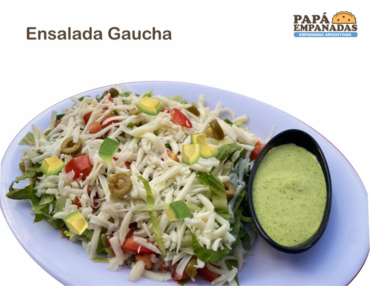 ´Deliciosa ensalada con Queso mozzarella, lechuga, tomate, aceitunas y aguacate acompañada de aderezo de cilantro y ajo.