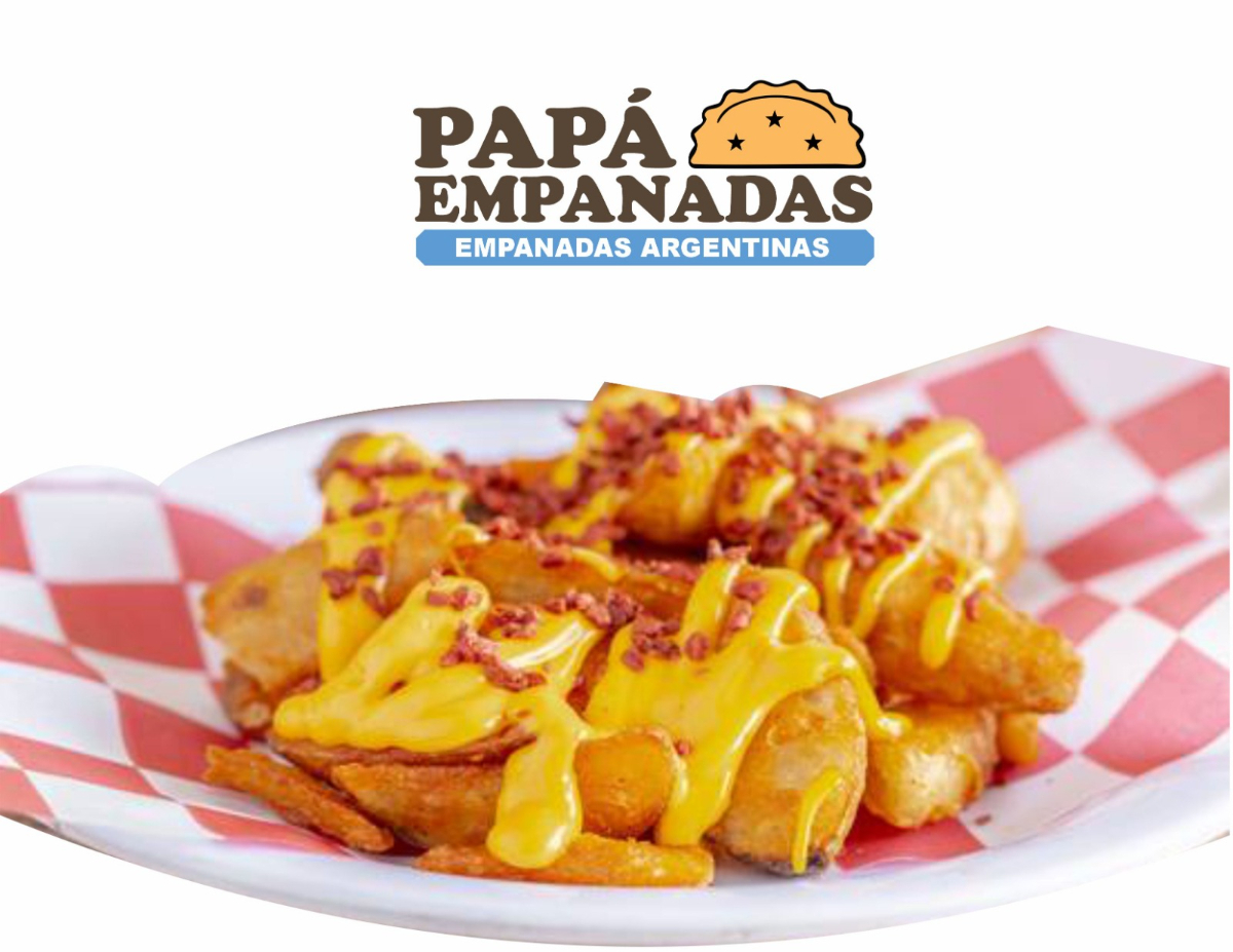 Papas gajo sazonadas con queso amarillo y tocino deshidratado.