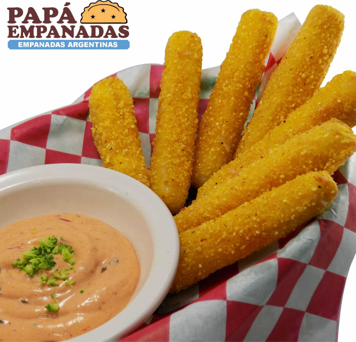 6 pzas De dedos de mozzarella empanizados acompañados de aderezo chipotle.