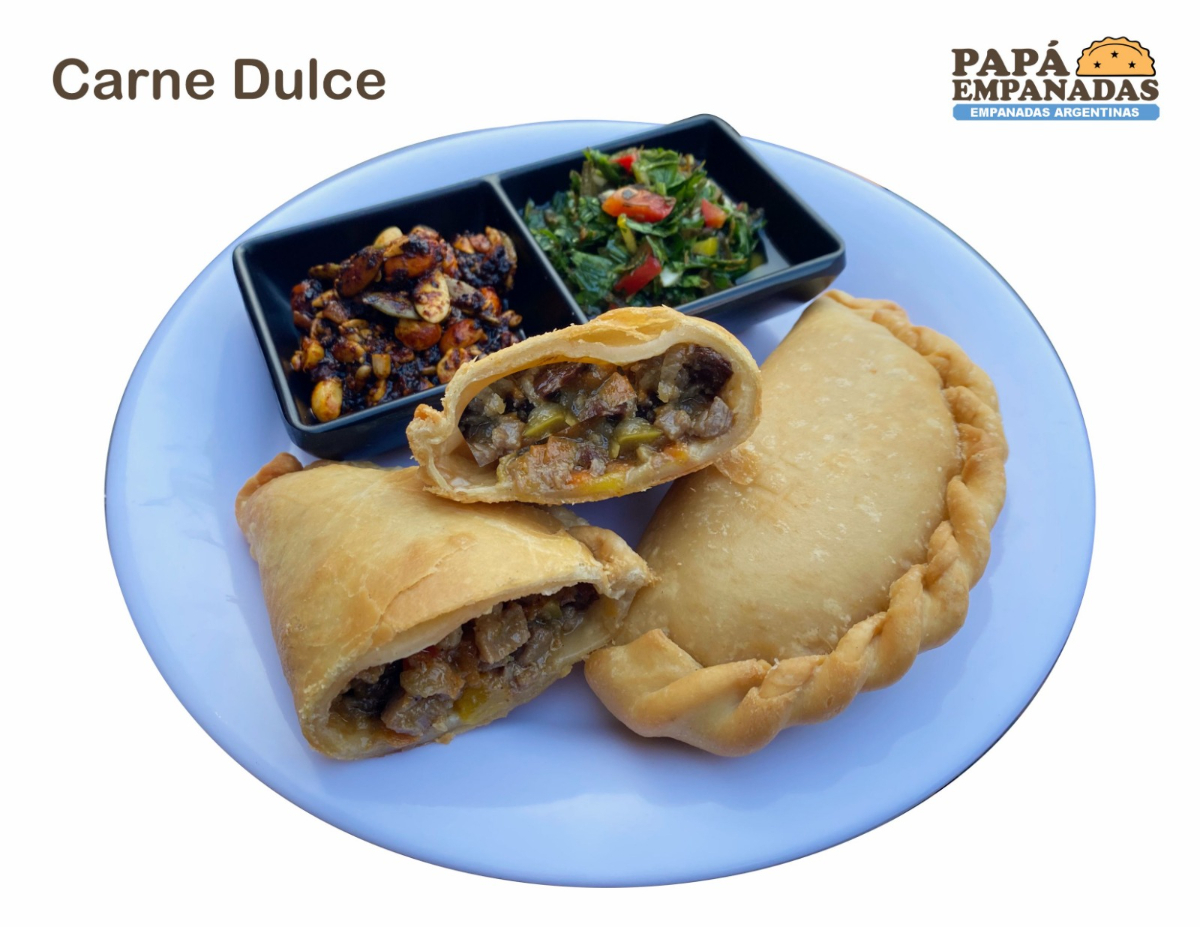 Empanada rellena de carne de primera con un toque dulce de pasas, aceitunas y pimientos.