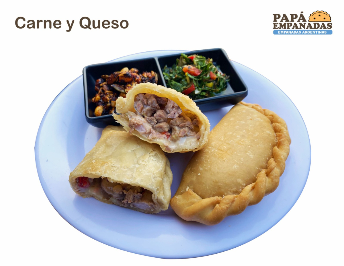 Empanada rellena de carne de res de primera calidad cortada a cuchillo y queso mozzarella.