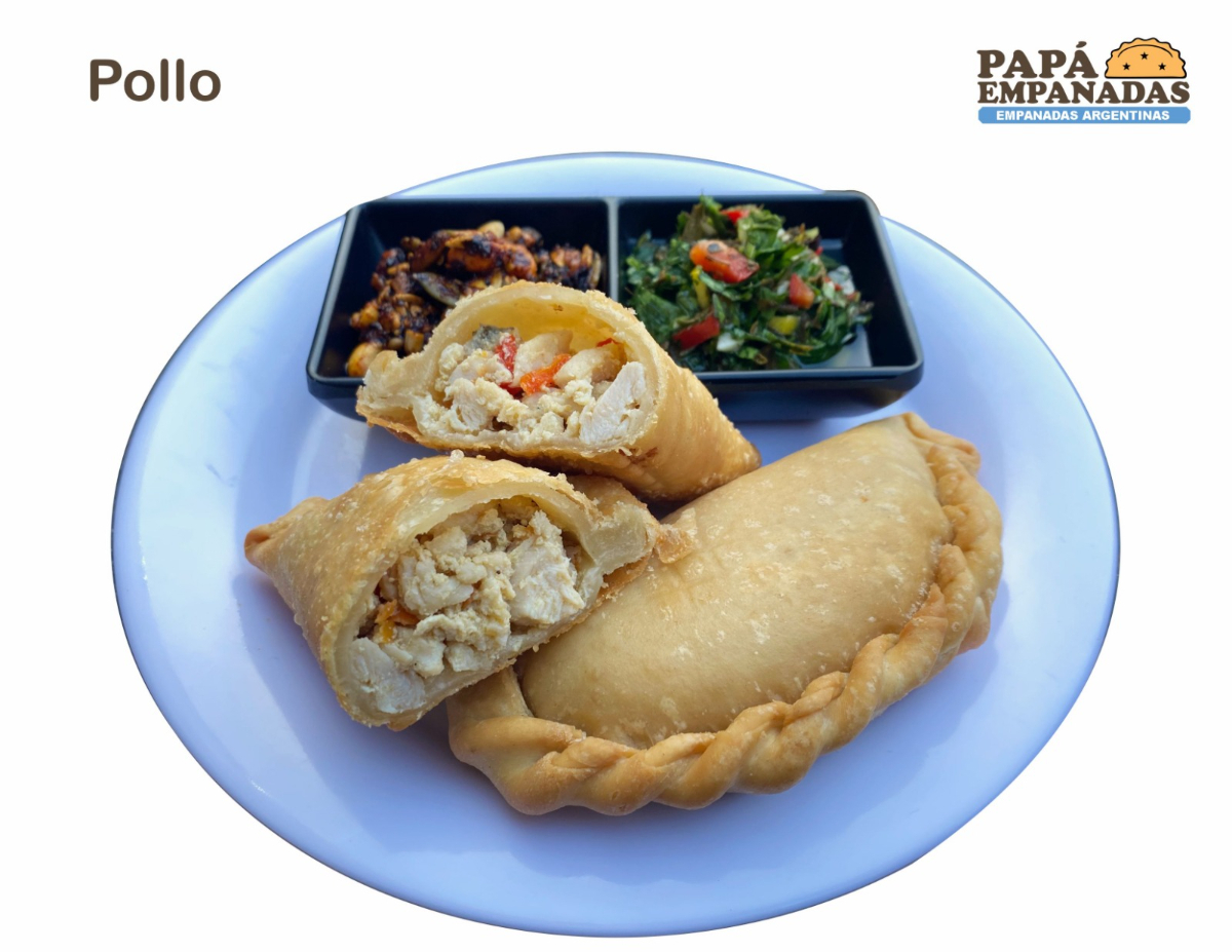 Empanada rellena de pechuga de pollo, pimientos, especias y un toque de mantequilla.