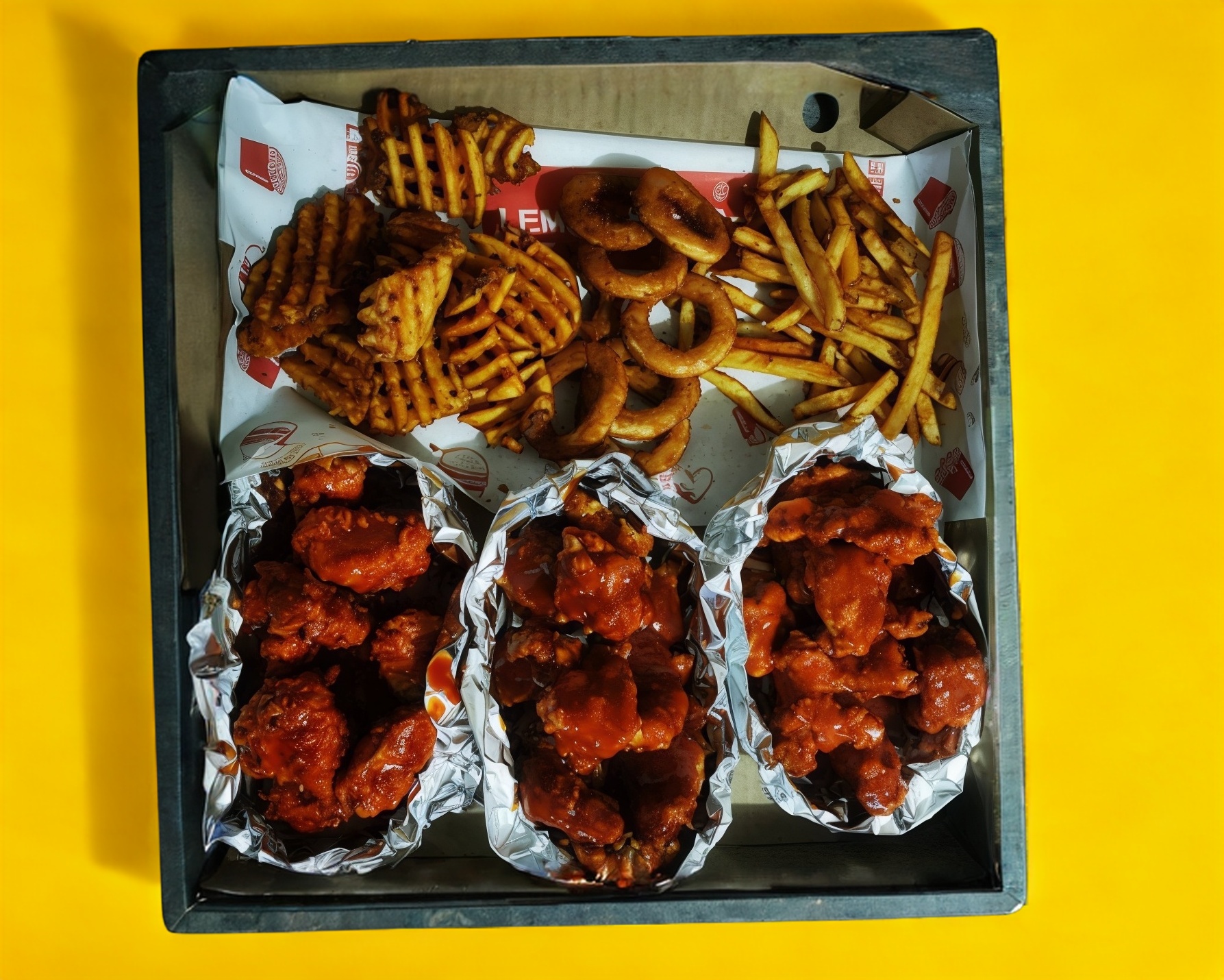 Para 3 ó 4 personas, 900 gr. de boneless, 400 gr. de alitas, 1 orden de dedos de queso, 1 orden de aros de cebolla, 1 orden de papas crisscut y 1 orden de papas a la francesa.