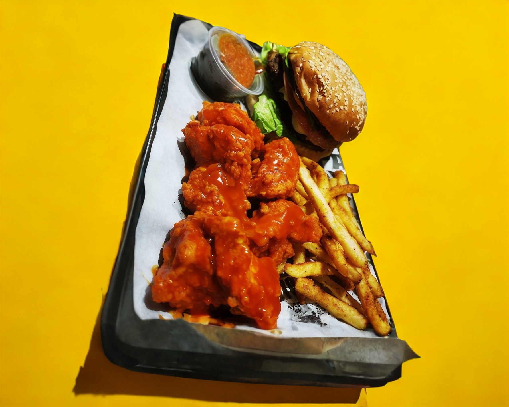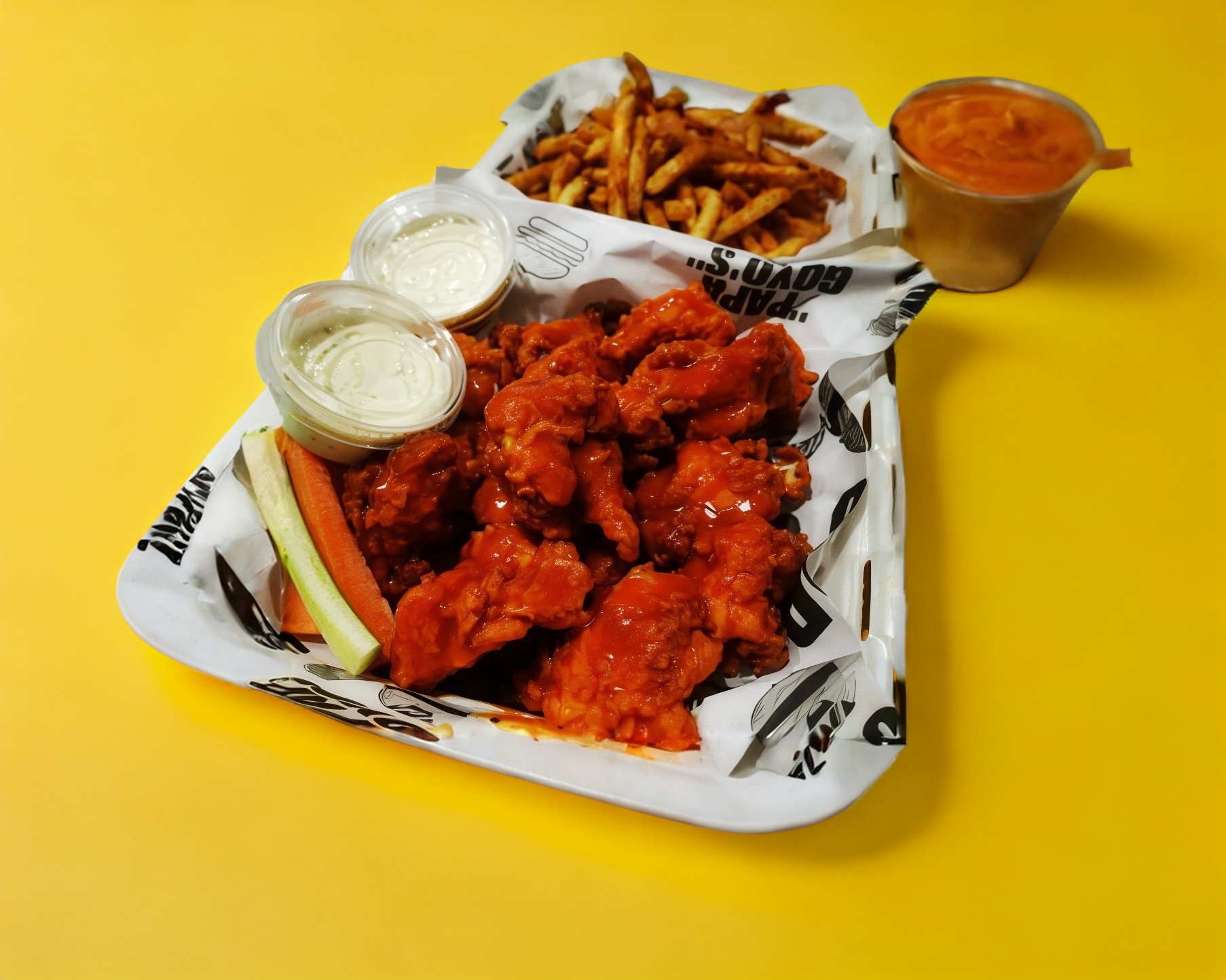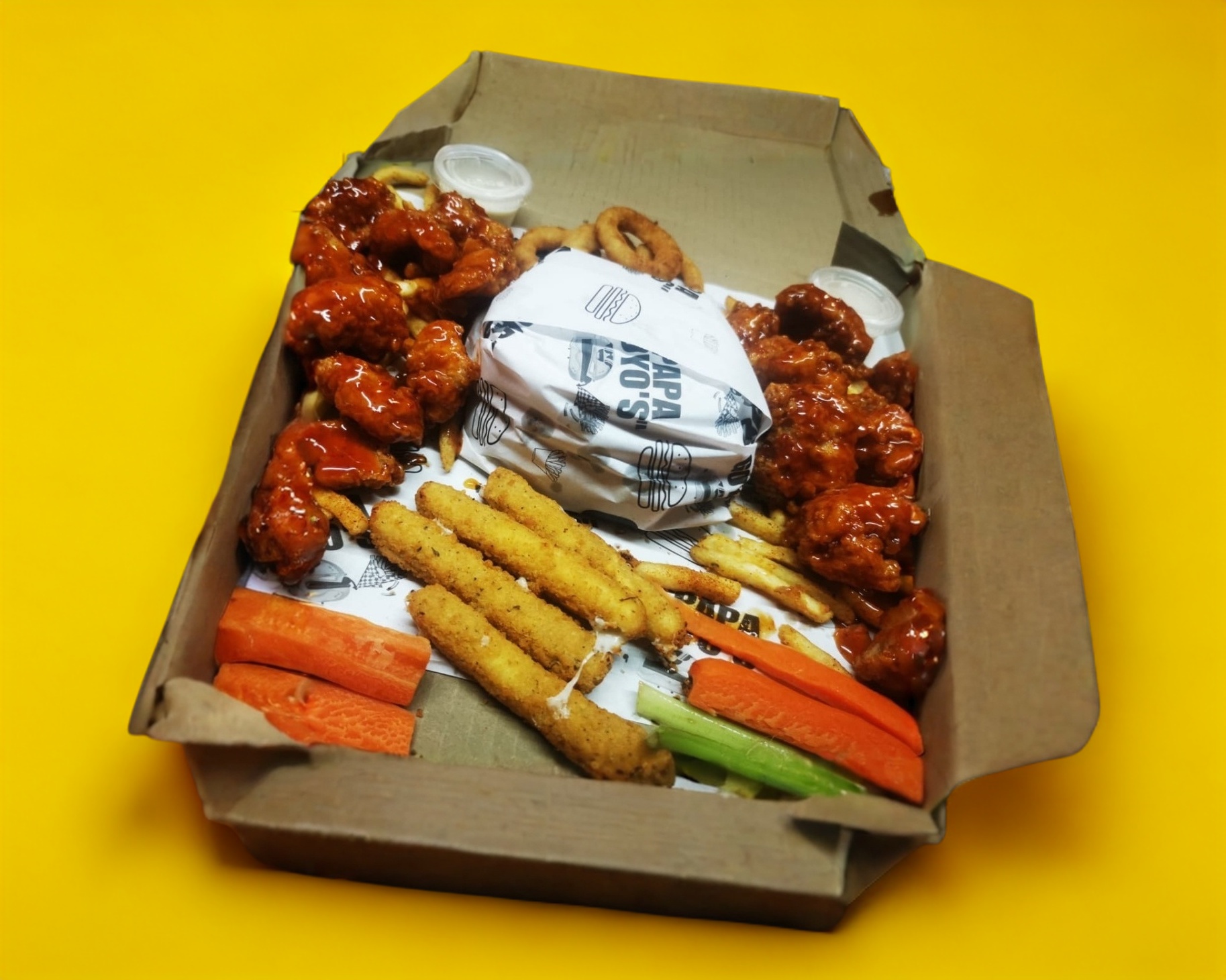 Para 2 ó 3 personas, 1 burger clásica, 1/2 kg. de boneless, 4 dedos de queso, 4 aros de cebolla, 2 ordenes de papas a la francesa, aderezo ranch, apio y zanahoria.