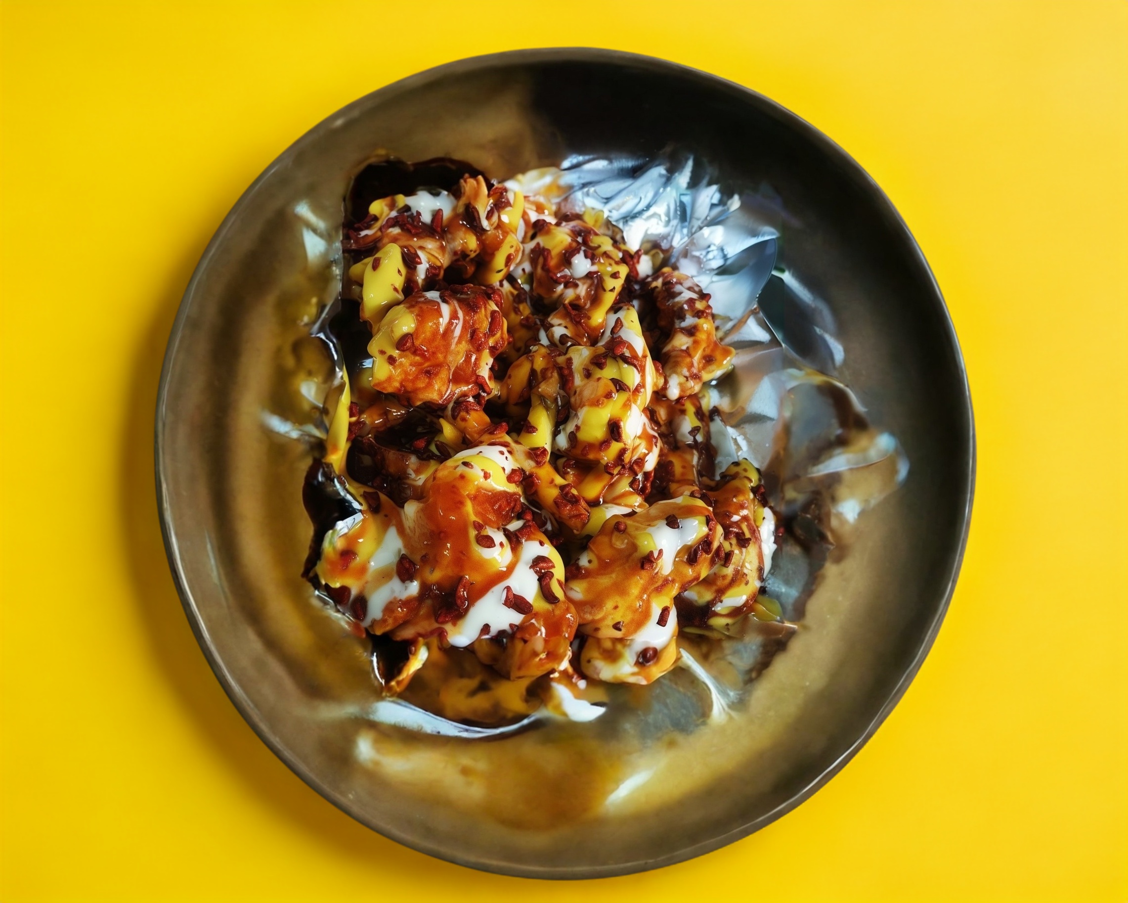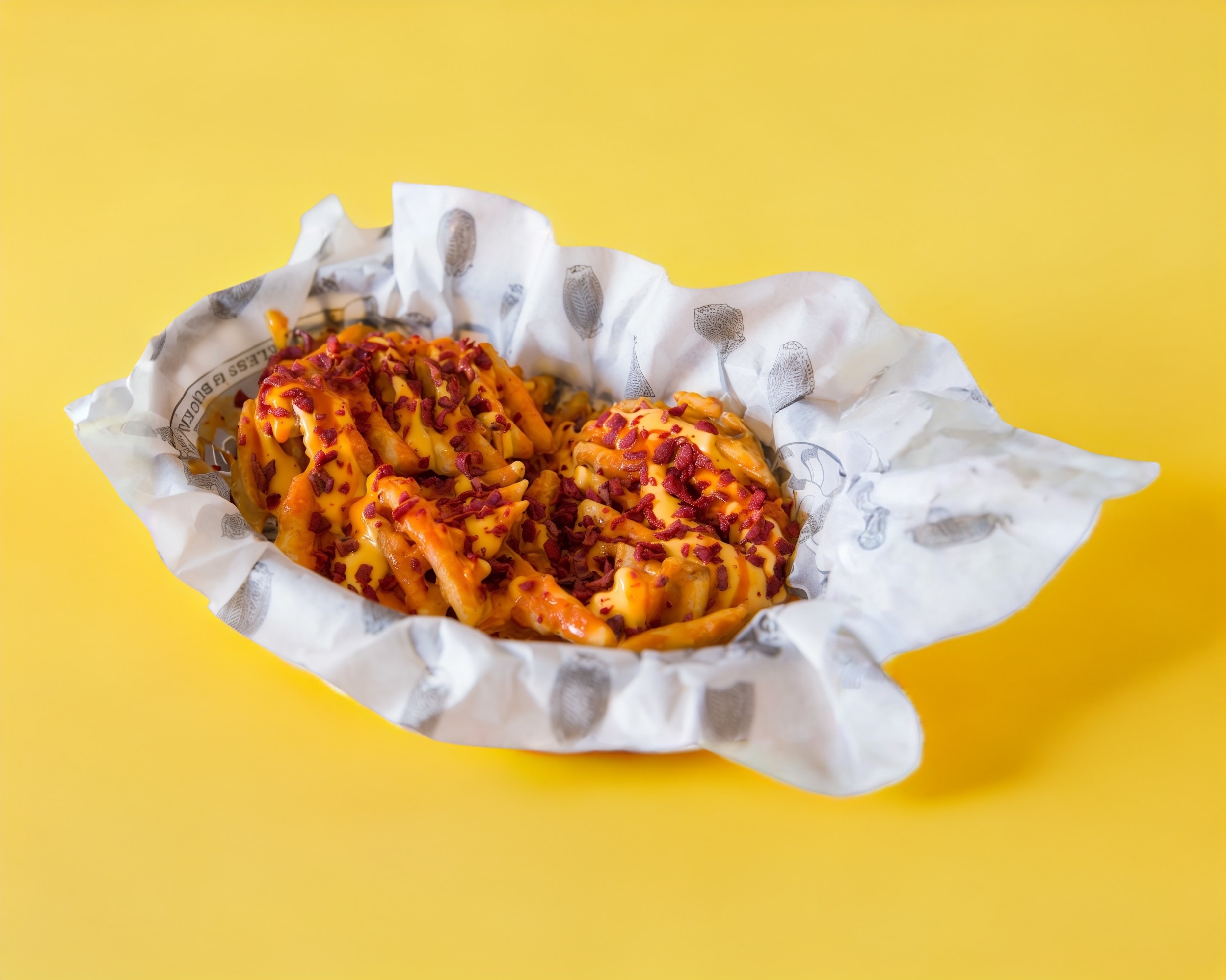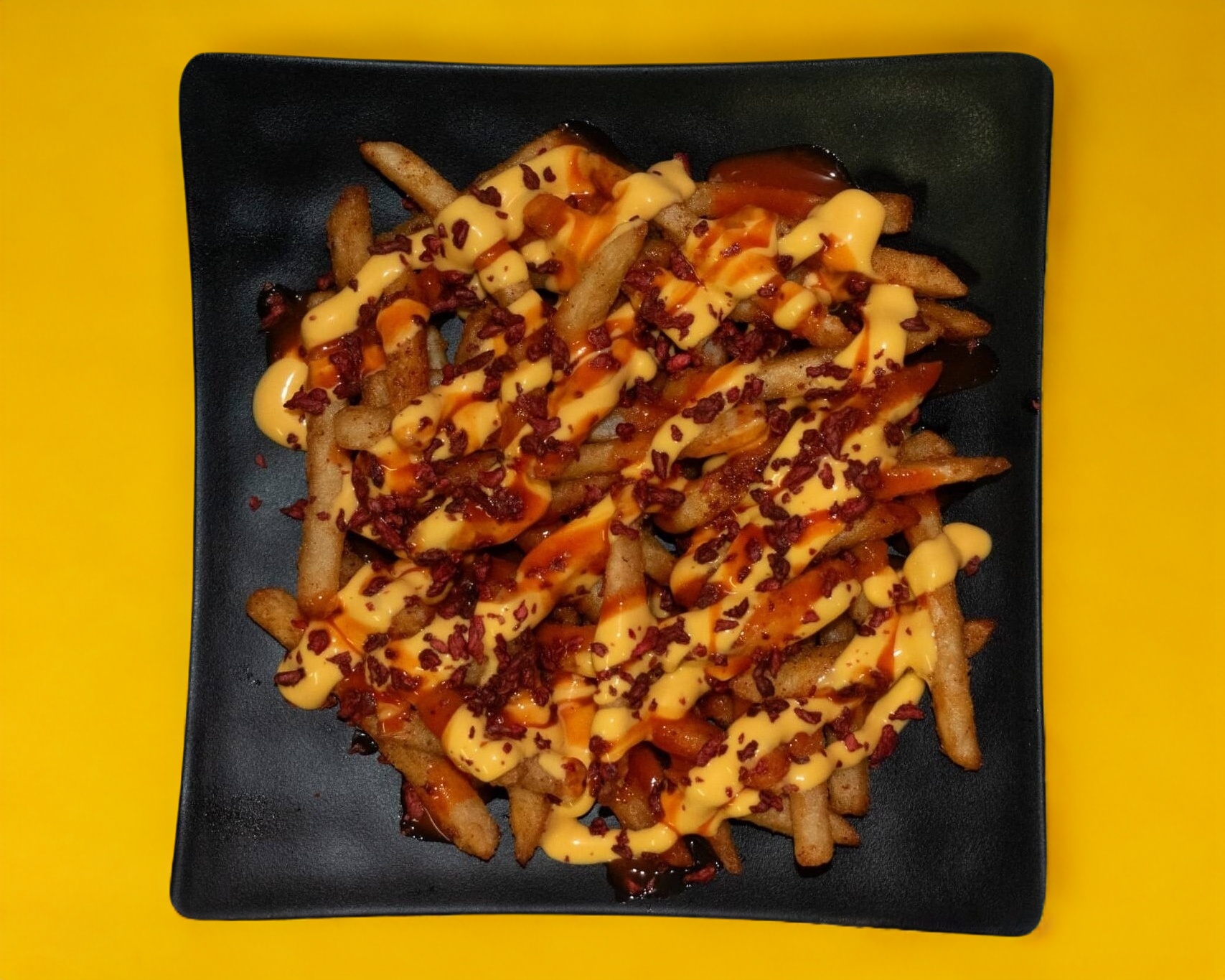 Papas fritas con queso, salsa de alitas y tocino deshidratado.