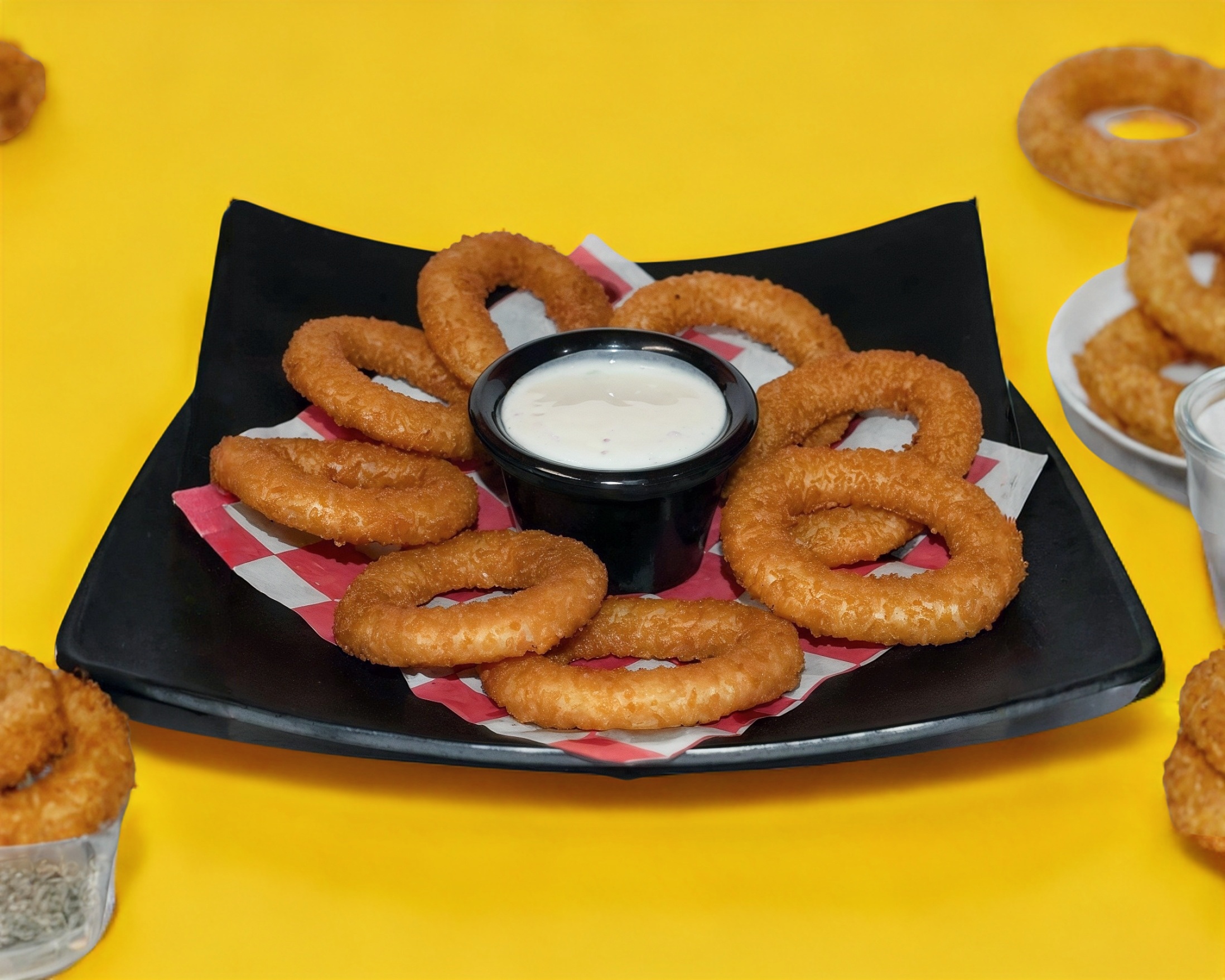 8 Aros de cebolla crujientes, incluye aderezo ranch.