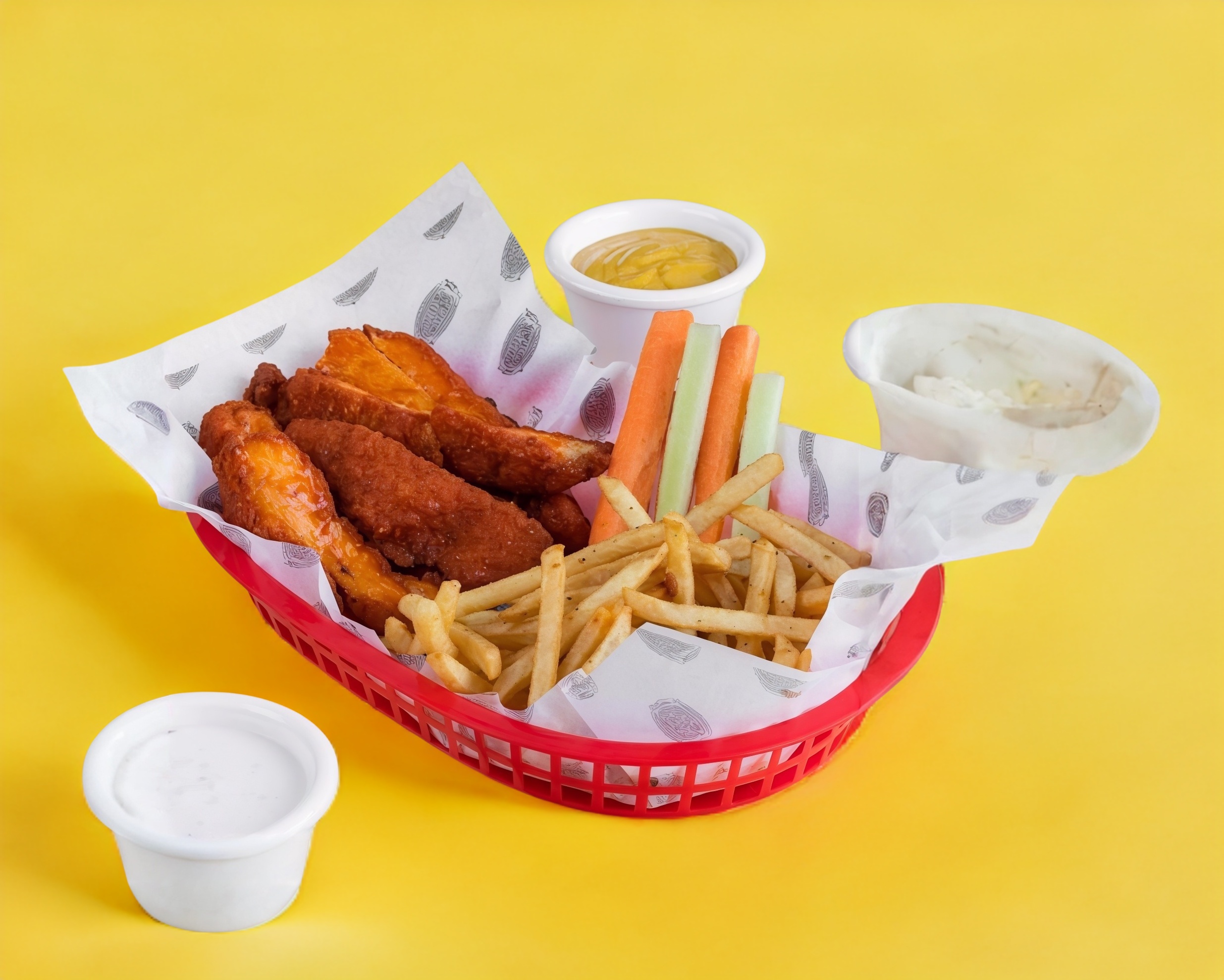 250 gr. de pechuga de pollo empanizada y frita, servida con papas fritas en salsa de tu elección, acompañada de zanahoria, apio y aderezo ranch.