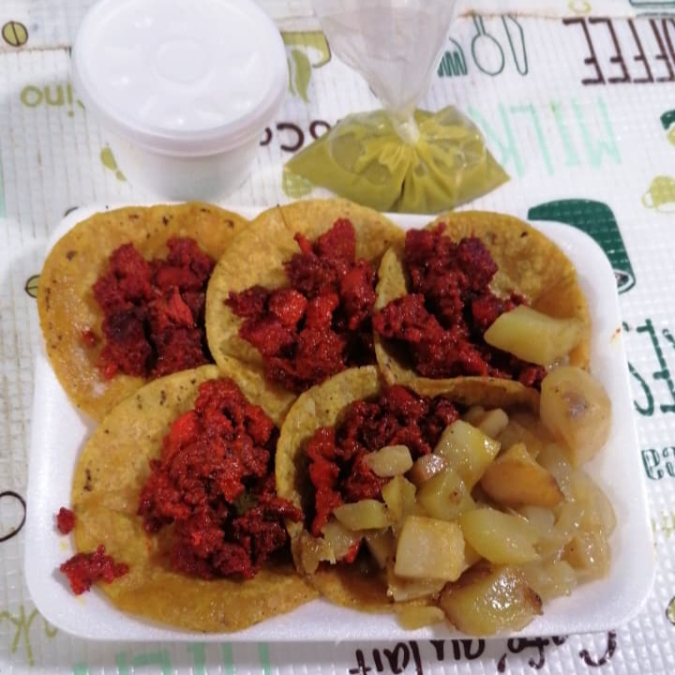 5 Tacos de carne asada en tortilla de maíz nixtamalizado hecha al momento, acompañados de salsa, cebolla y papa dorada y limón.
