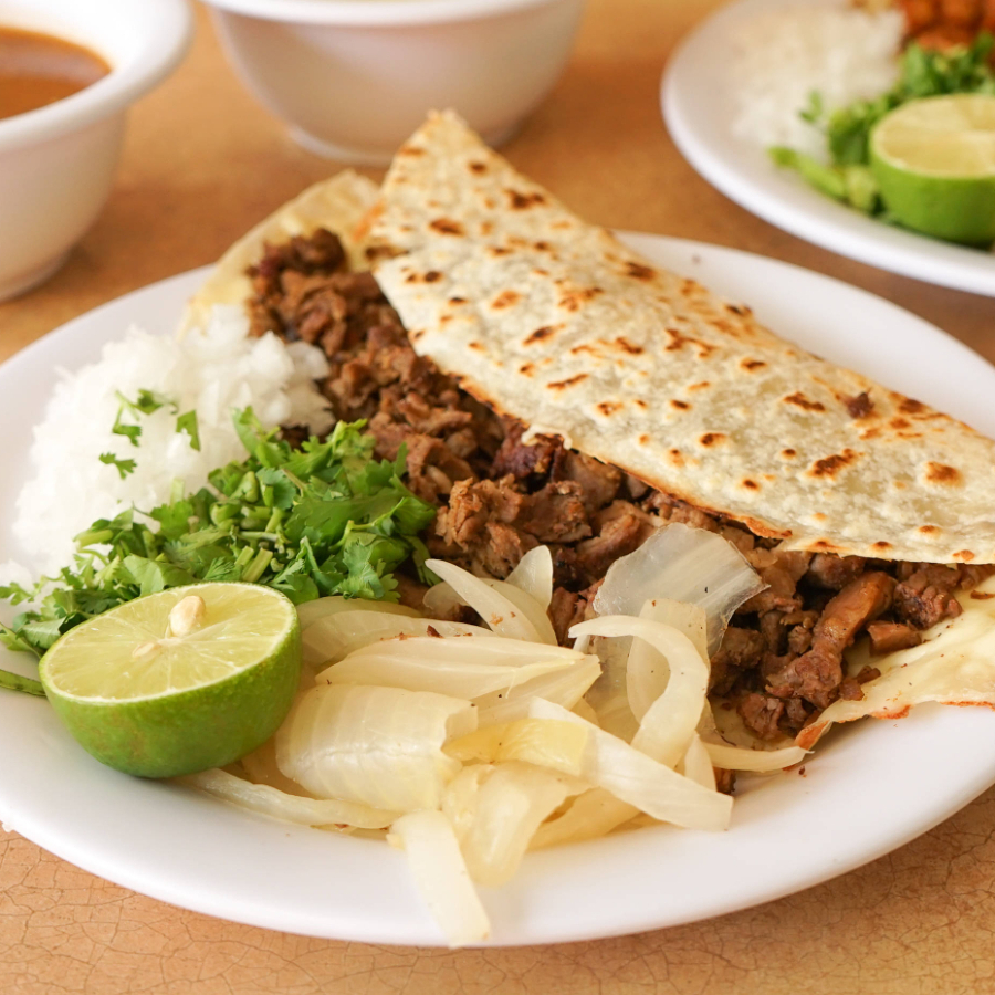Tortilla grande de harina hecha al momento, rellena de carne asada, acompañada de salsa, cebolla y papa dorada limón.