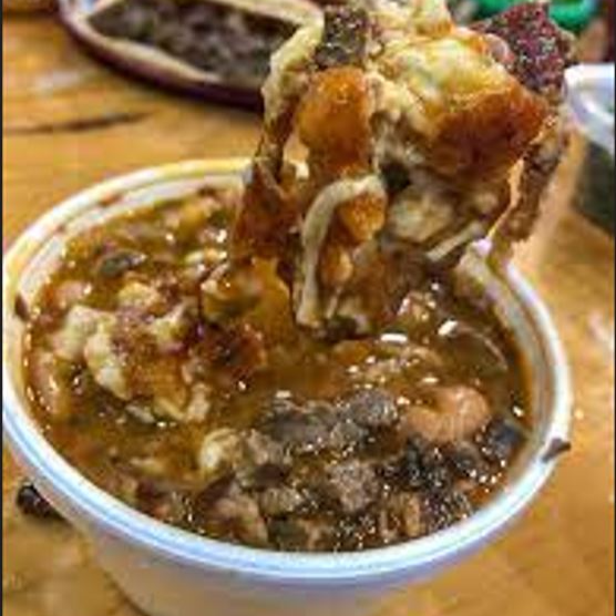 Medio litro de frijoles a la charra, preparados con queso y carne asada.