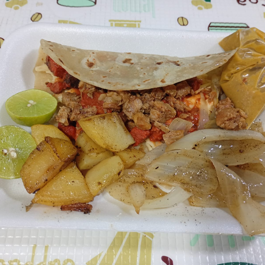 Tortilla grande de harina hecha al momento, rellena de carne de trompo, acompañada de salsa, cebolla y papa dorada y limón.