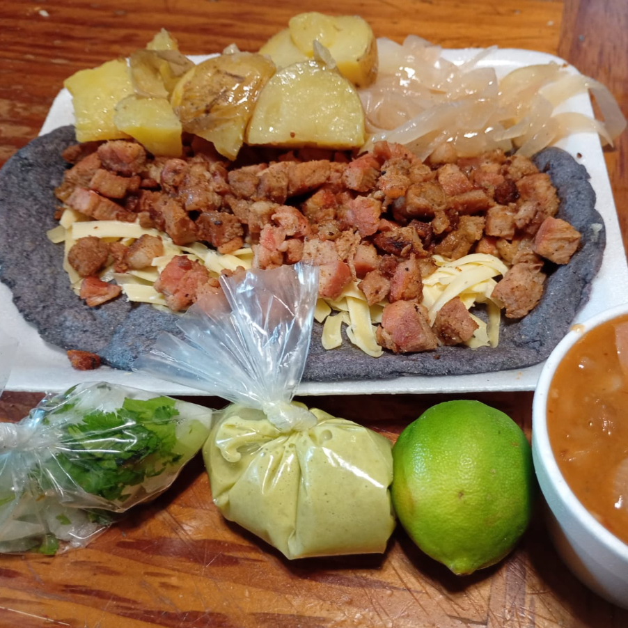 tortilla grande nixtamalizada recien echa azul con queso carne salsa limon cebolla y papa dorada