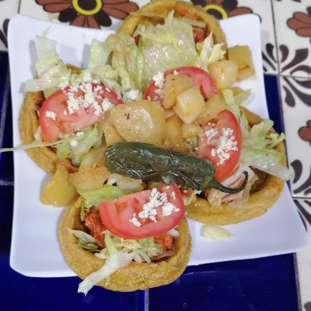 4 Sopes con carne, lechuga, tomate, papa dorada y chile toreado.