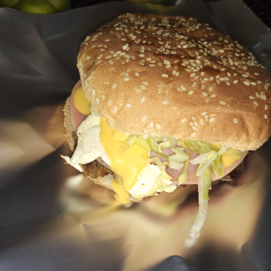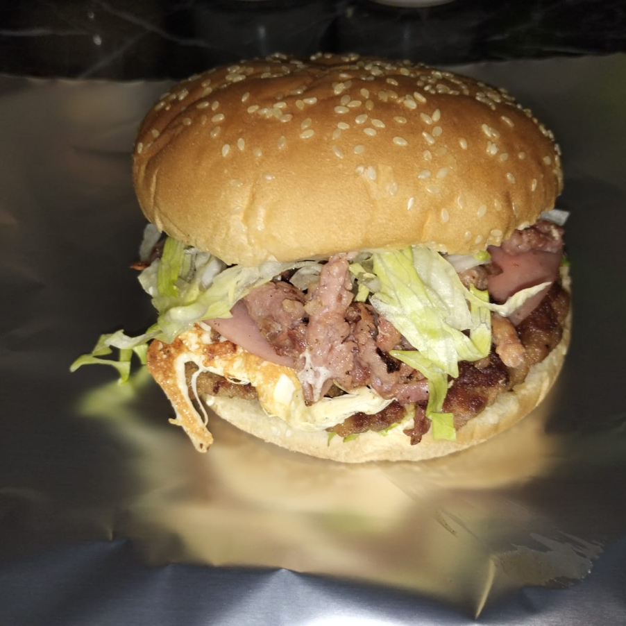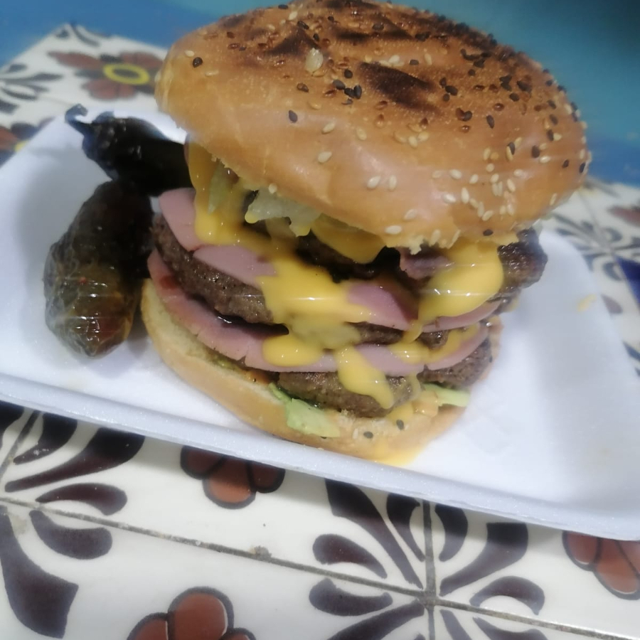 Doble carne, doble queso, jamón, aderezo de la casa y chile toreado, papas y cebolla dorada.