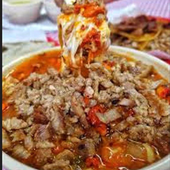 Tortilla grande de harina hecha al momento, rellana de carne asada y carne de trompo, acompañada de salsa, cebolla y papa doraday limón.