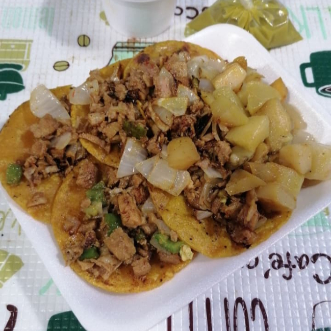 5 Tacos de carne de trompo en tortilla de maíz nixtamalizado, acompañados de salsa, cebolla y papa dorada y limón.